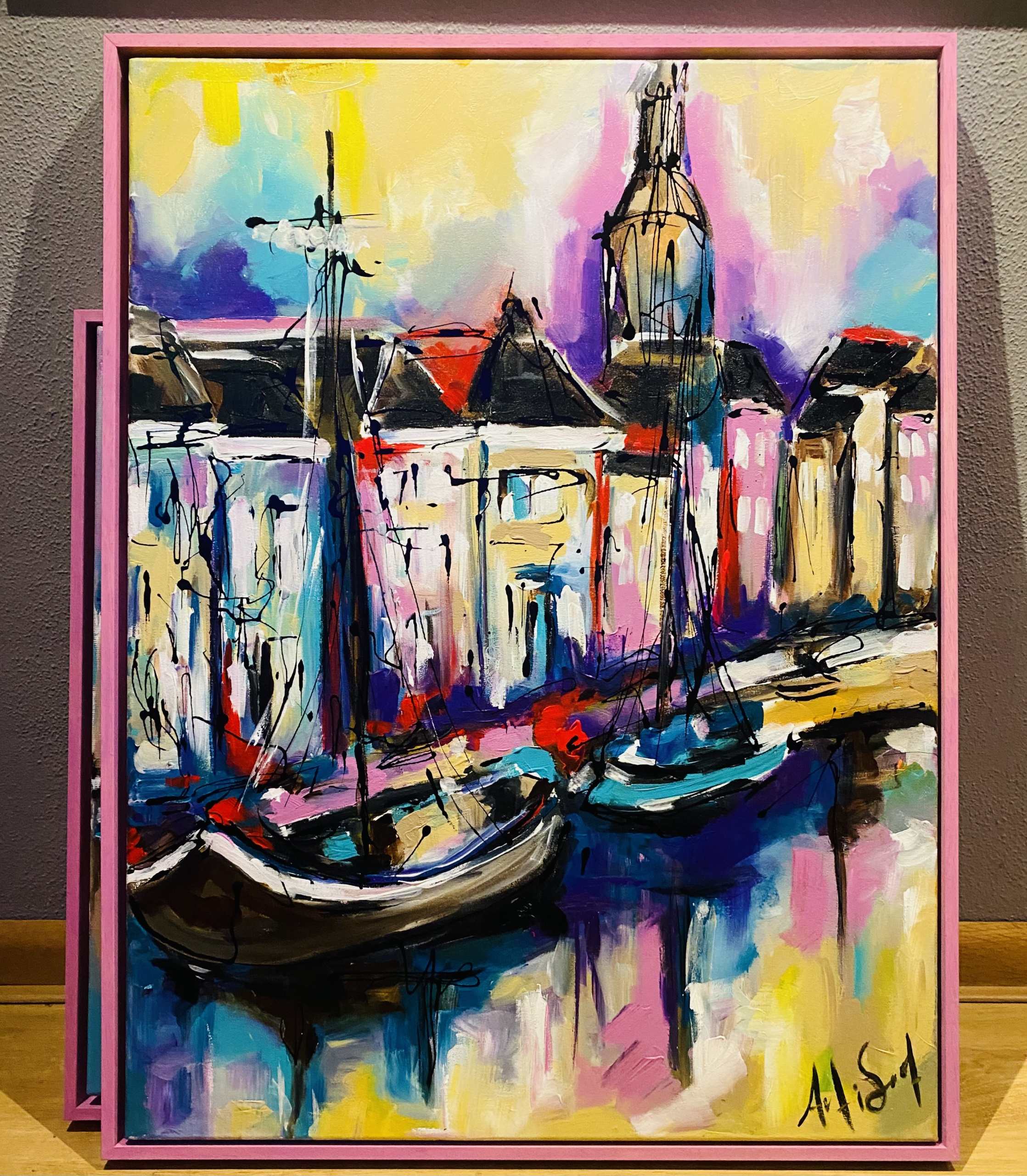 Schilderij van de hoge der Aa in Groningen. geschilderd op een doek van 60 x 80, de prijs in inclusief de bijpassende lijst.